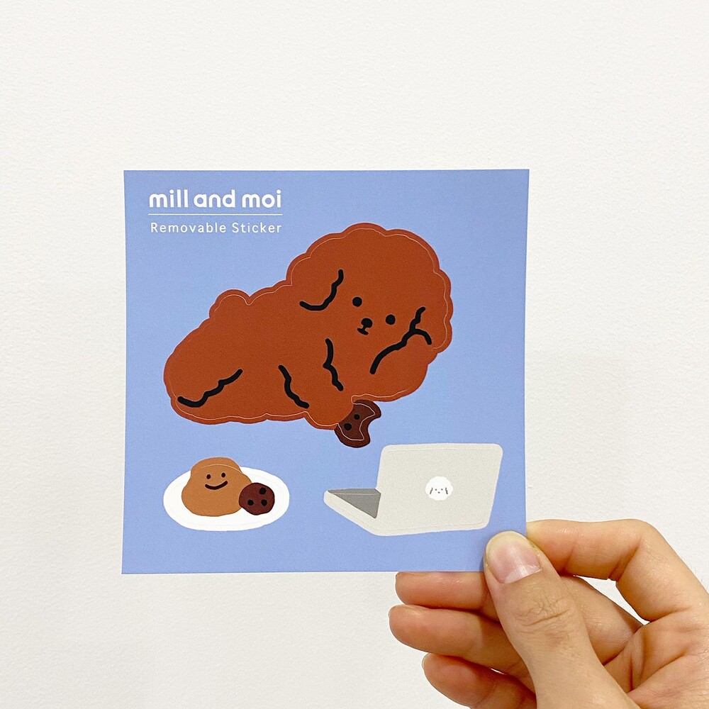 유튜브를 보고, 편하게 누워 쿠키를 베어 먹으며 뒹굴거리는 귀여운 푸들의 모습을 담은 리무버블 스티커입니다.