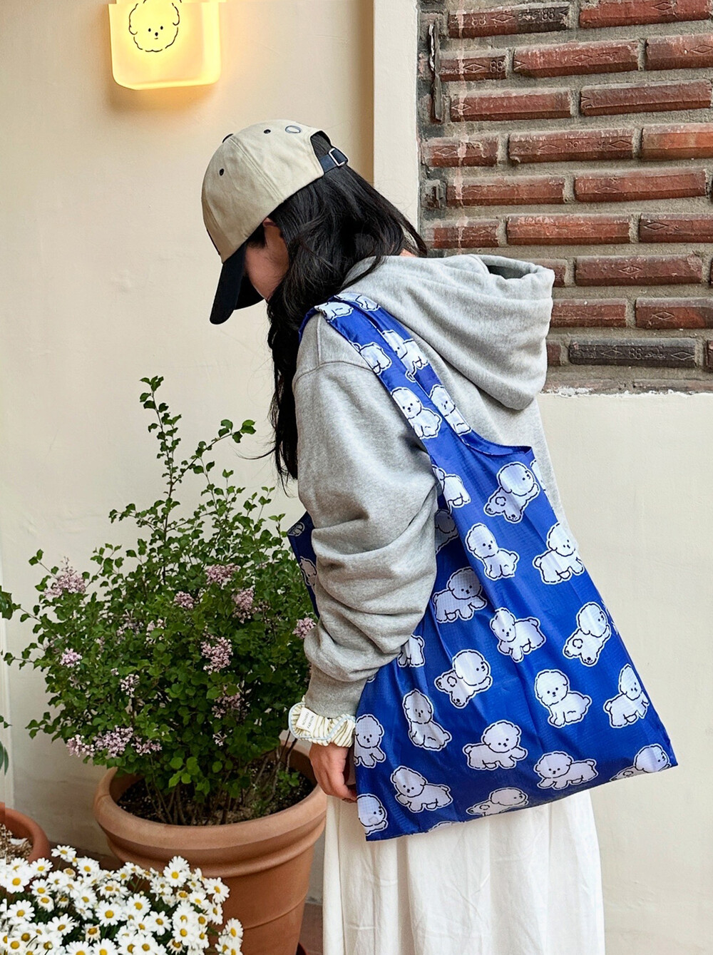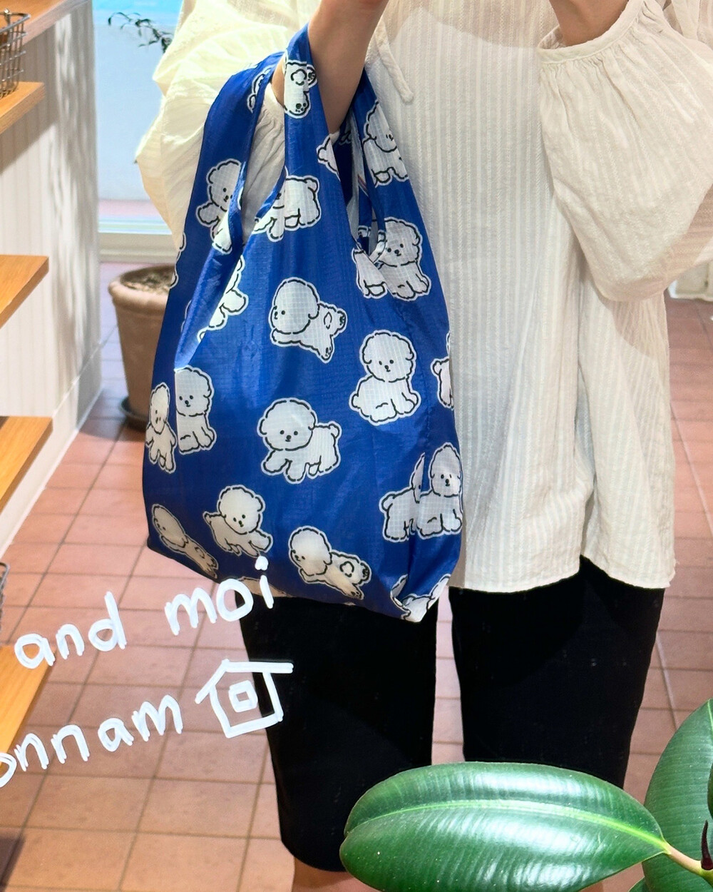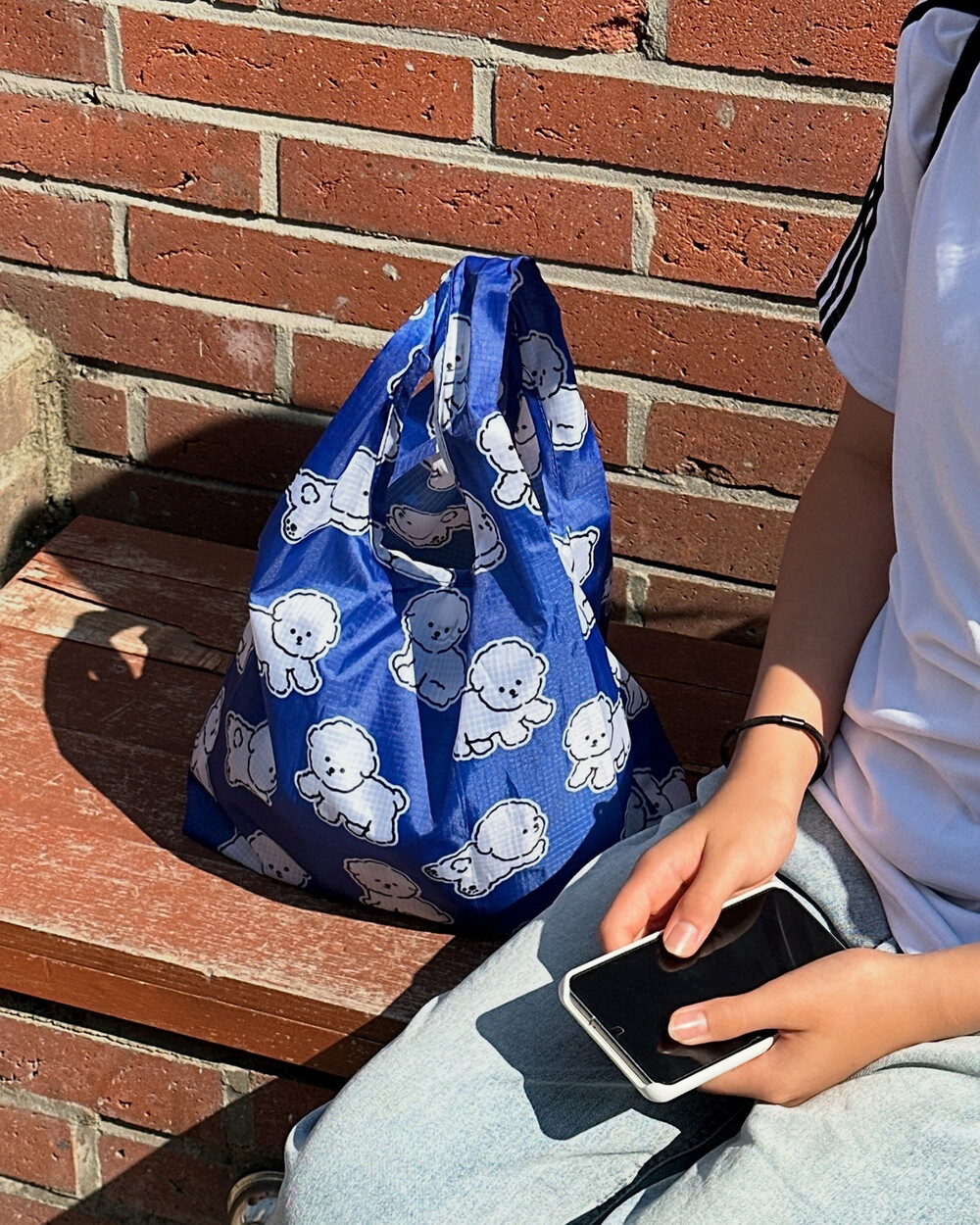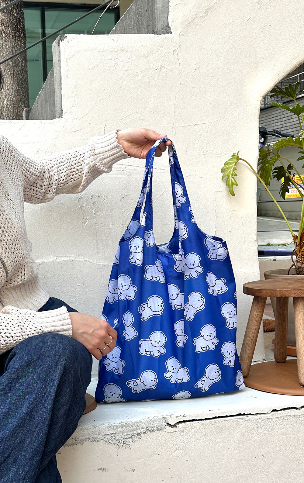 코발트 블루색에 하얀 보숑이 캐릭터 패턴으로 청량하고 시원한 느낌 가득한 장바구니!