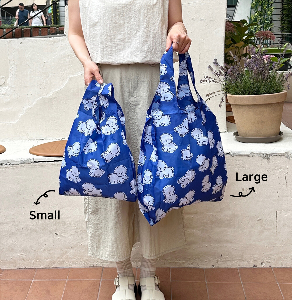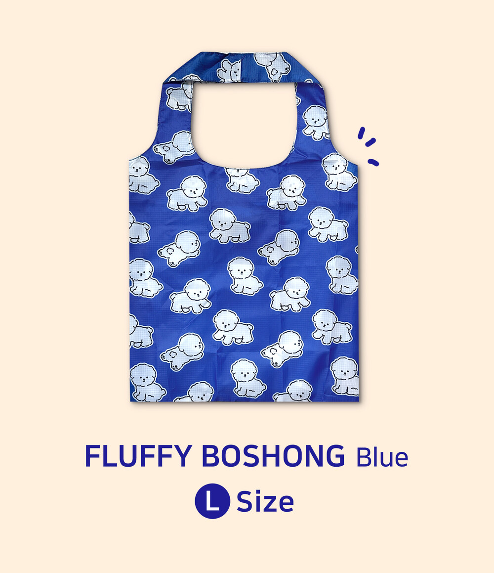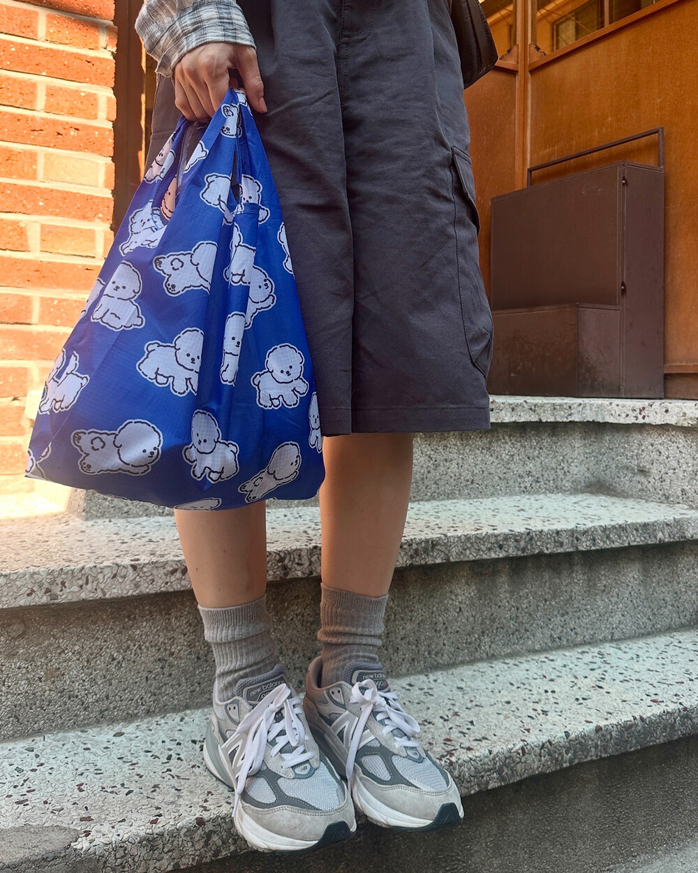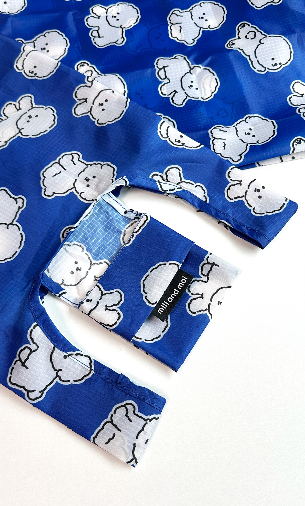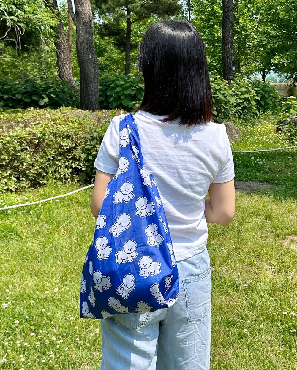 코발트 블루색에 하얀 보숑이 캐릭터 패턴으로 청량하고 시원한 느낌 가득한 장바구니!