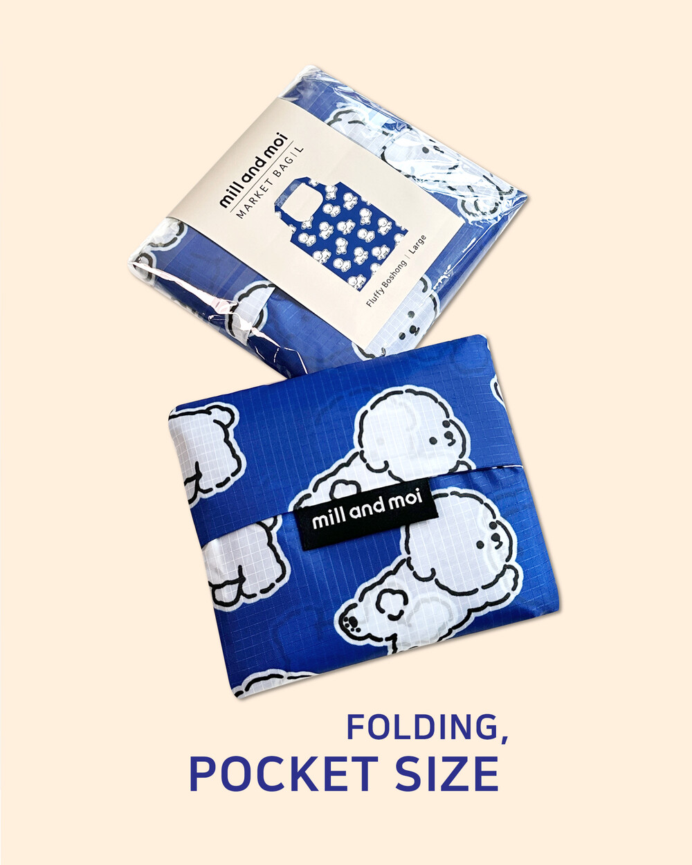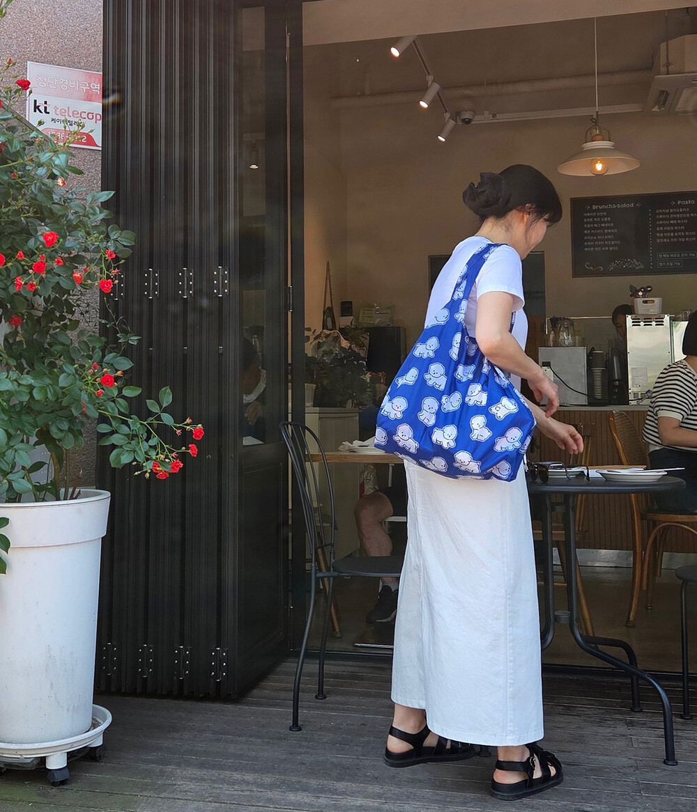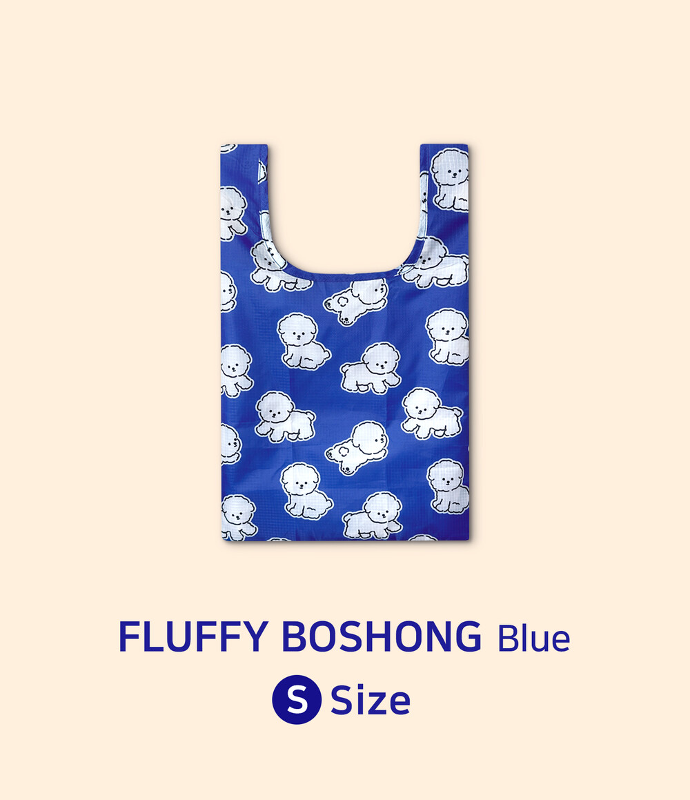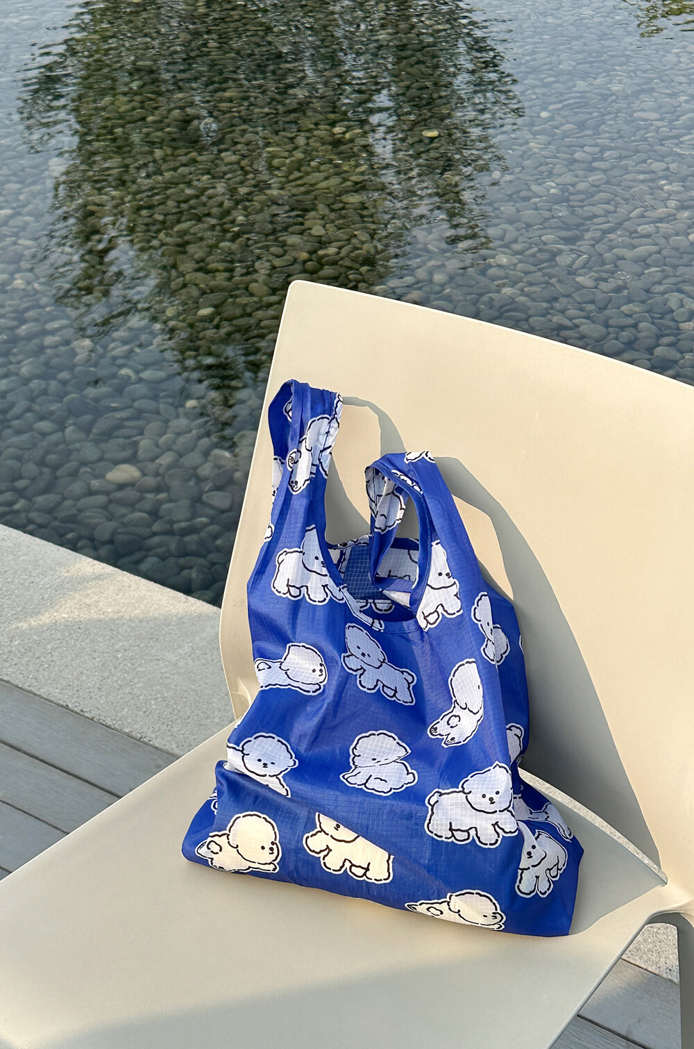 코발트 블루색에 하얀 보숑이 캐릭터 패턴으로 청량하고 시원한 느낌 가득한 장바구니!