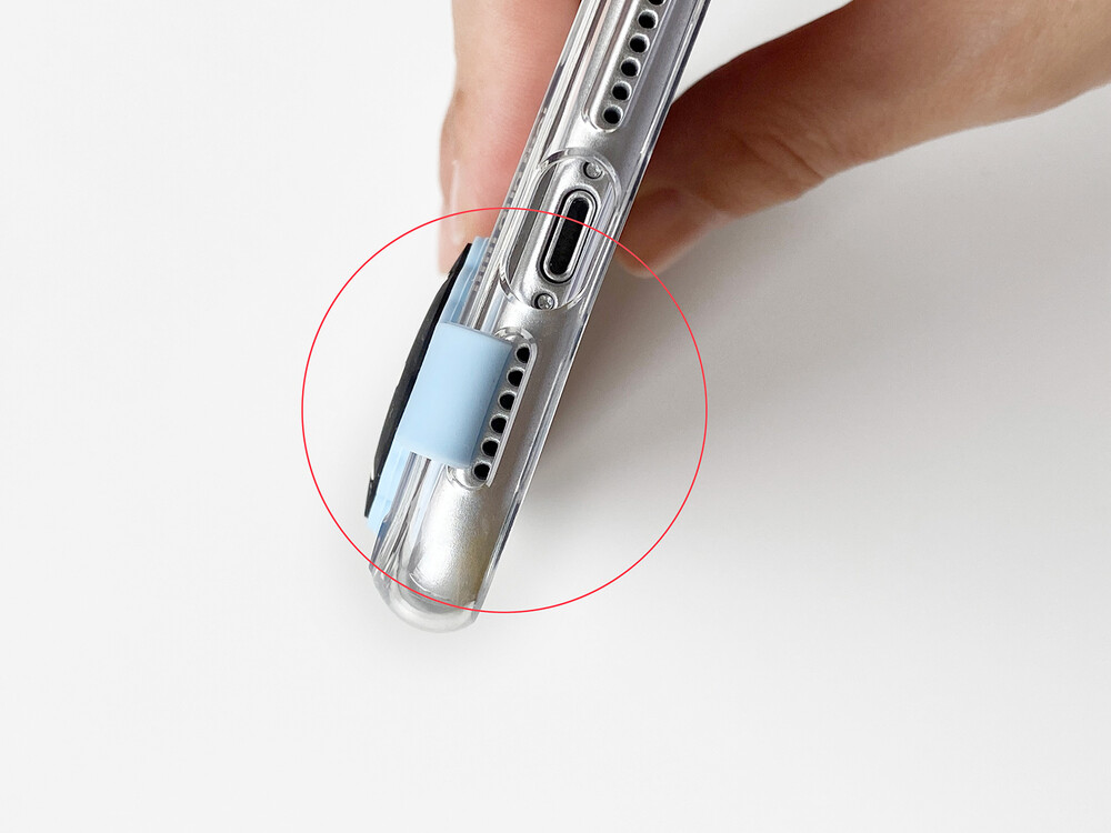 -하단 스트랩은 다른 구멍에 넣어 위치시켜주어도 좋지만 배터리 충전단자의 홈에 위치시켜주셔야 케이스가 가장 잘 밀착됩니다.