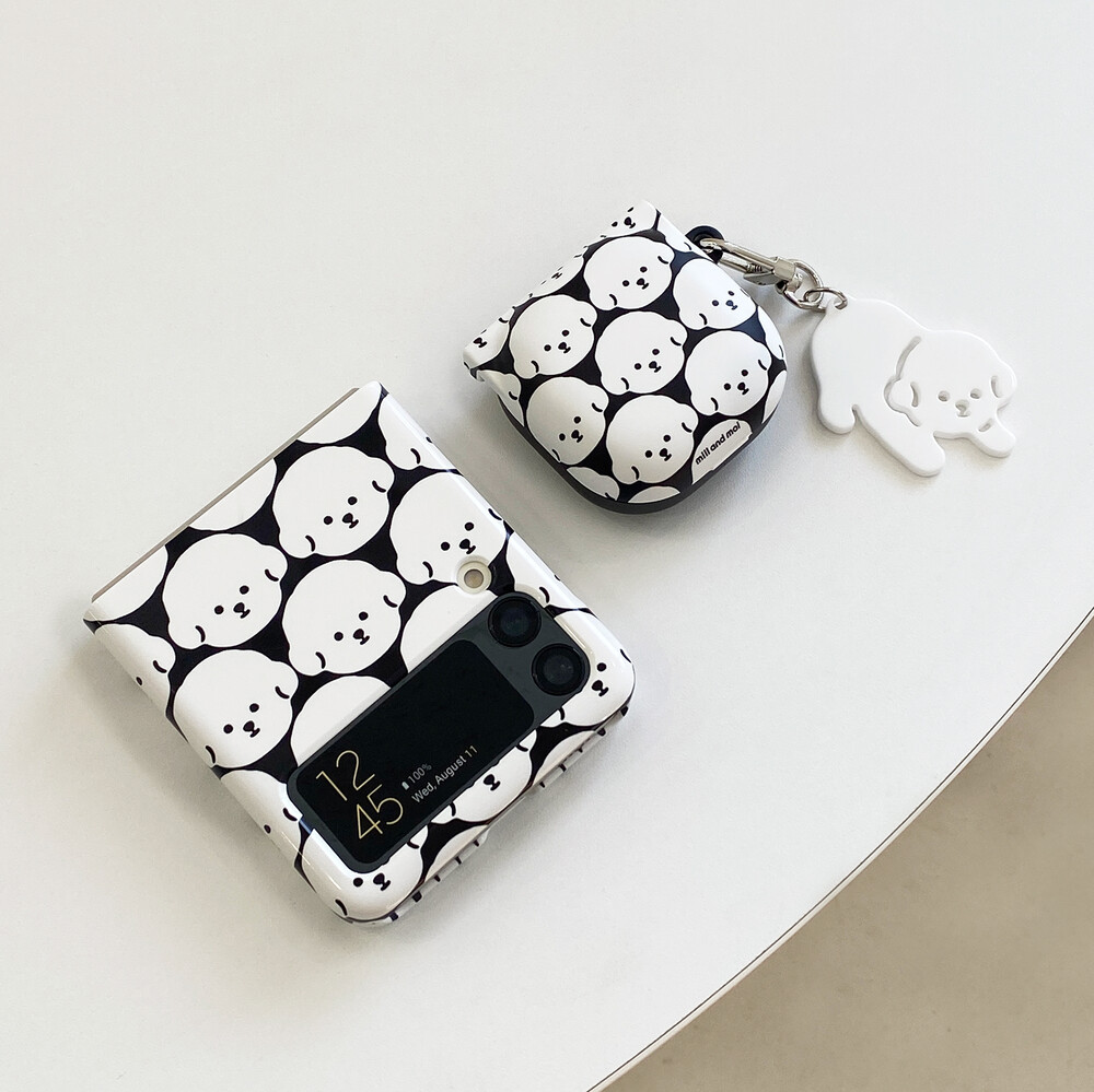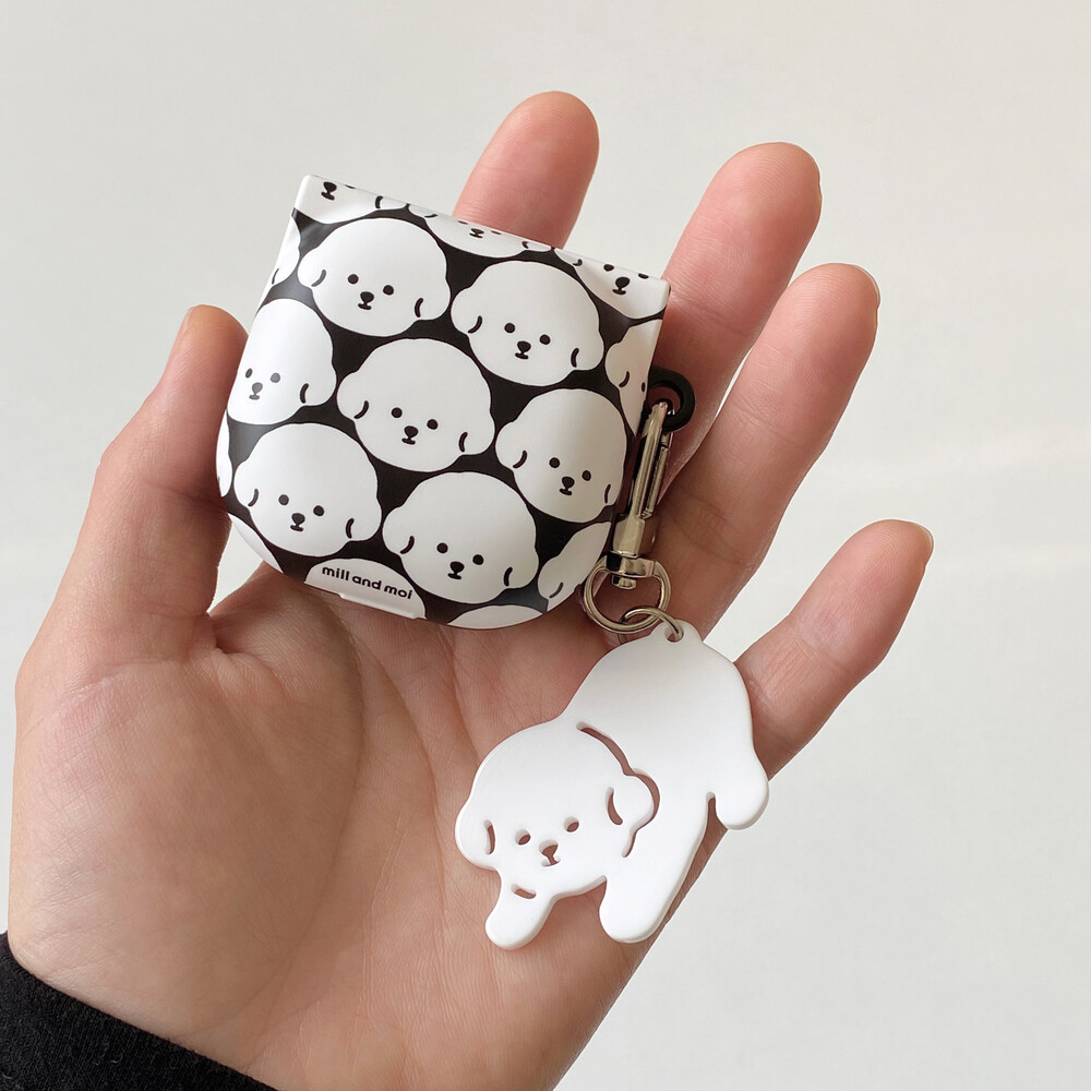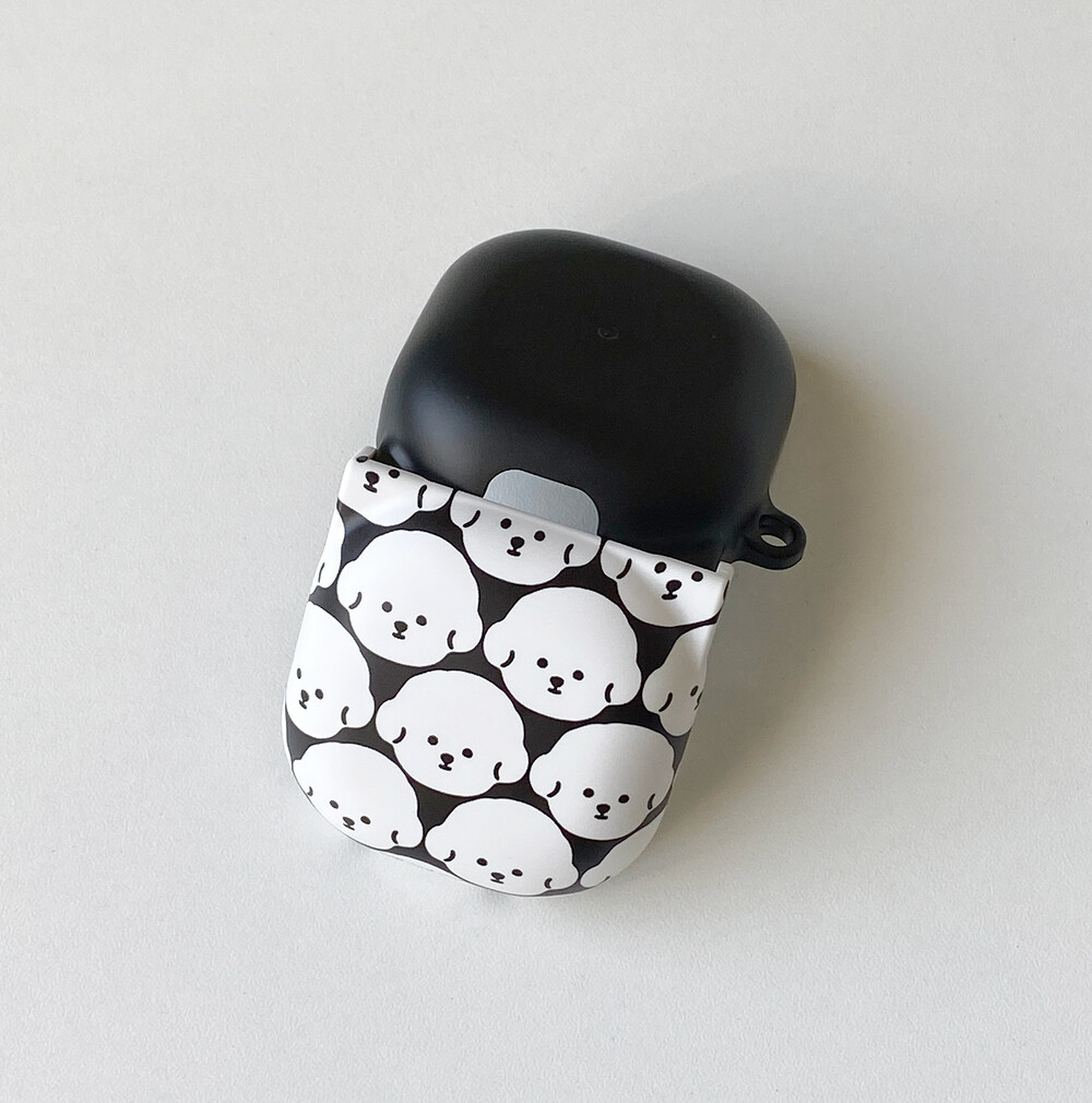 호빵처럼 동글동글 빵실한 헤어와 까만 눈코입이 매력적인 비숑 캐릭터, 보숑이의 얼굴이 가득한 귀여운 디자인의 버즈케이스입니다.