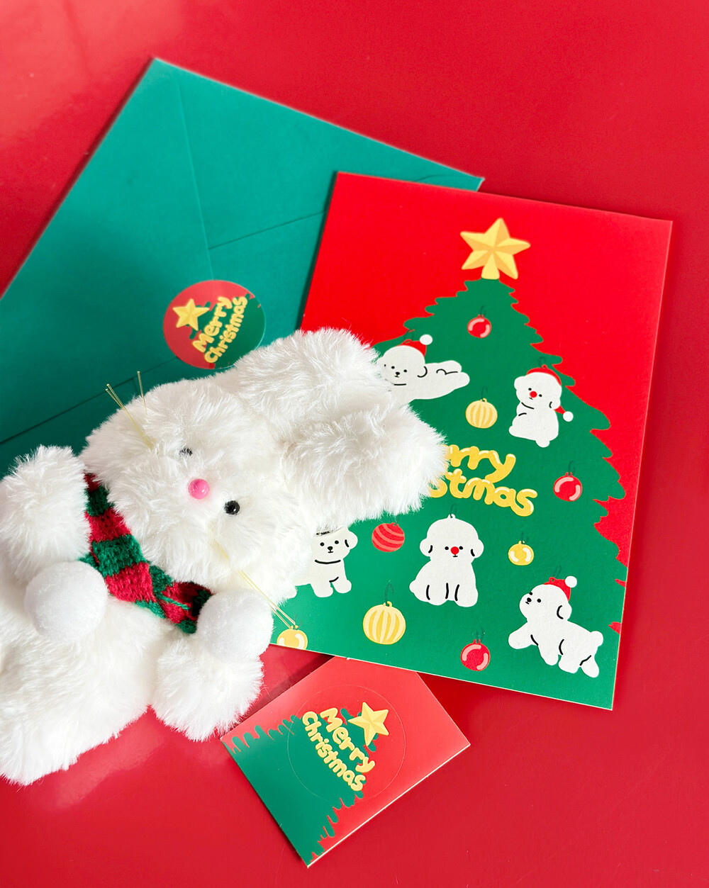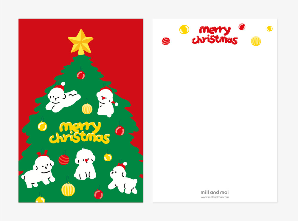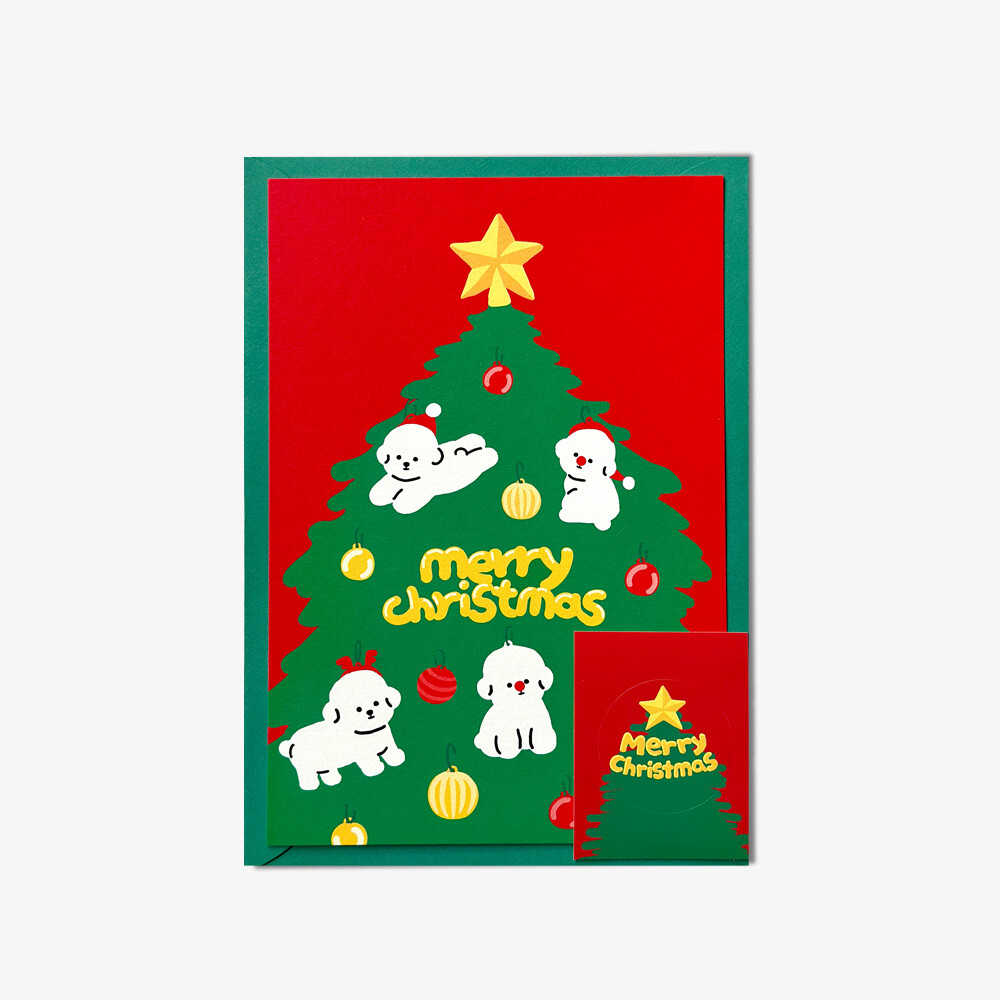 보숑이 오너먼트가 가득한 귀여운 초록 트리와 빨간바탕이 어우러져 크리스마스 느낌이 물씬 풍깁니다.