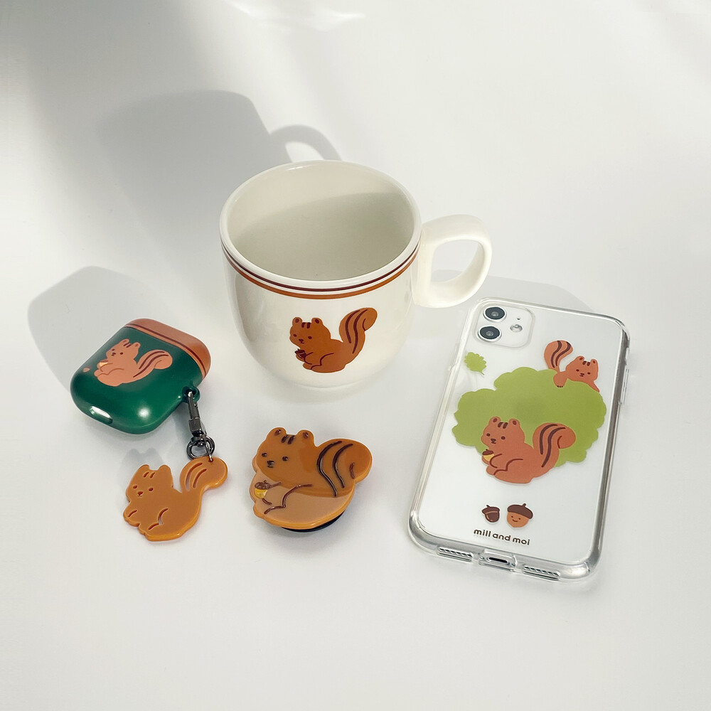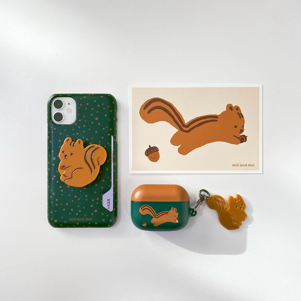 딥한 그린 색상의 바디와 카멜색의 뚜껑이 어우러져 왠지 모르게 빈티지한 느낌을 주는 디자인입니다. 앞 뒤로는 다람 앤 토리의 캐릭터가 그려져있어 귀여움까지 더해진 개성있는 케이스입니다.