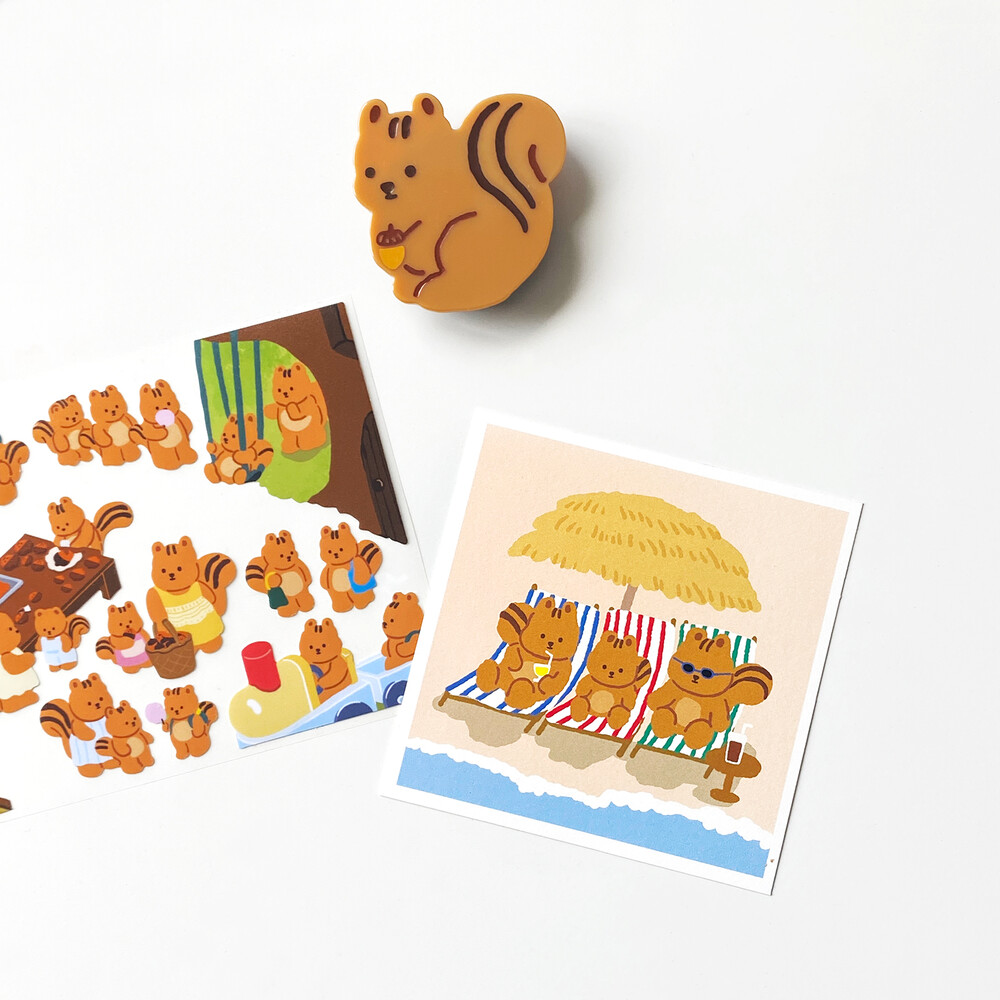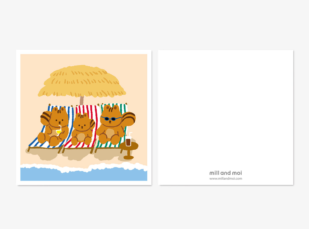 해변가의 선베드에 누워 여름휴가를 즐기는 다람이 가족의 귀여운 모습을 담은 여름 한정 미니 엽서입니다.