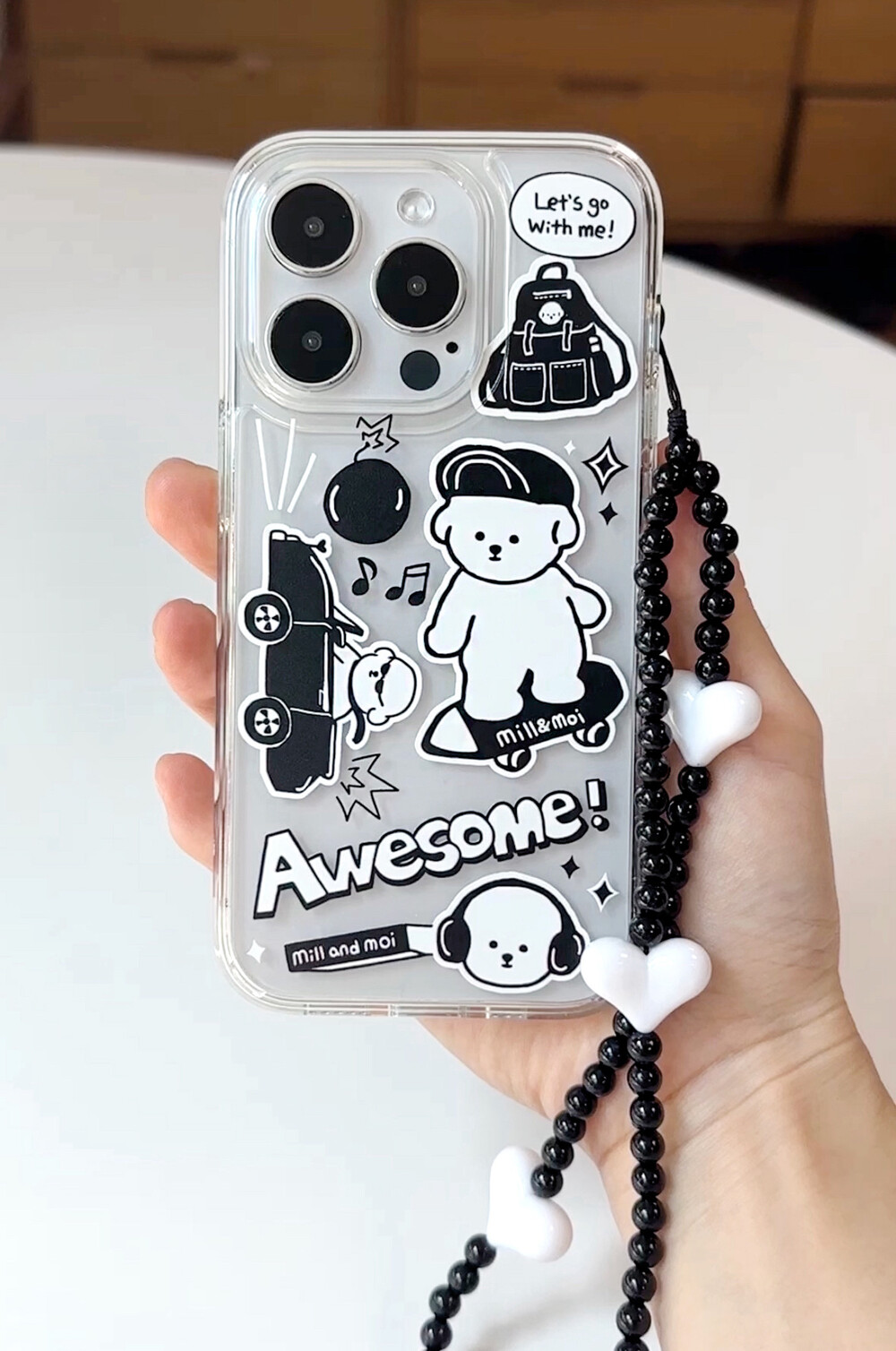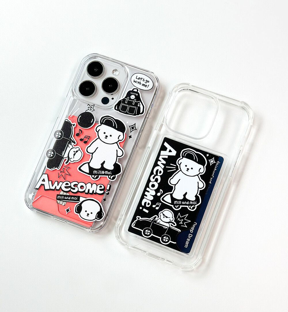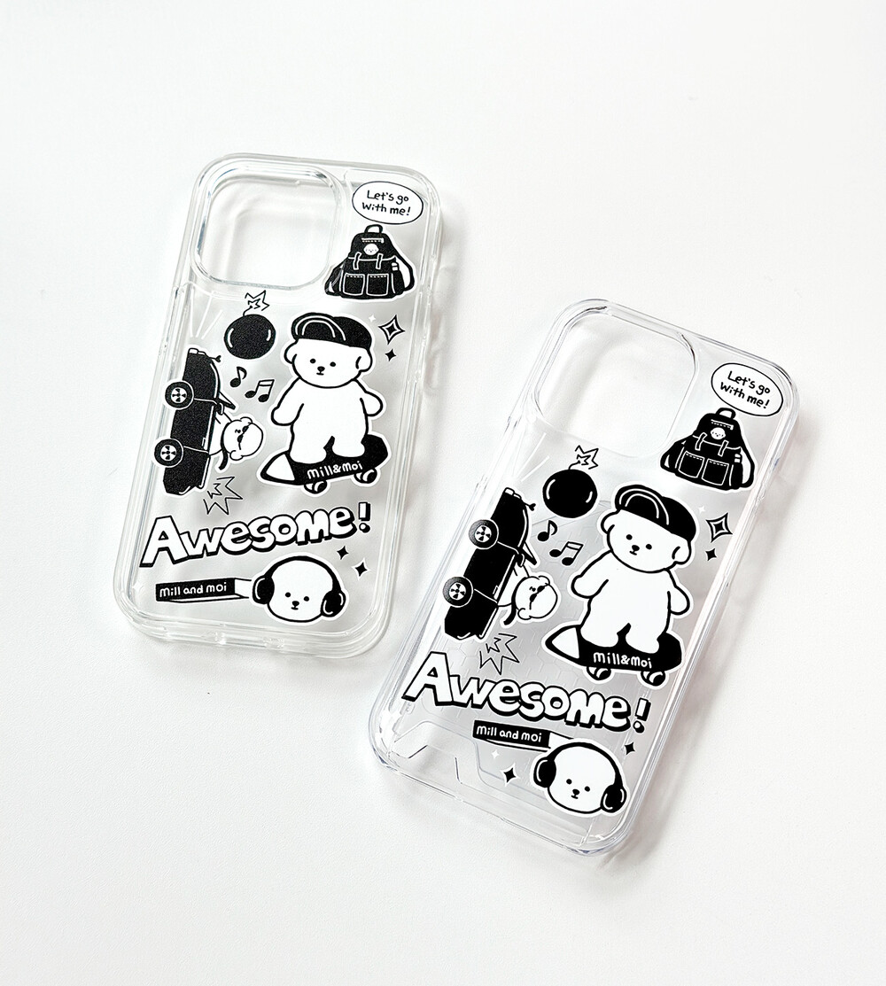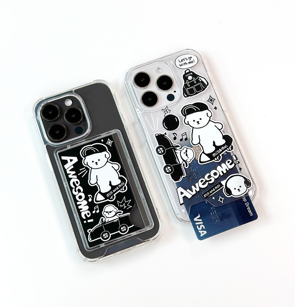 블랙&화이트의 심플한 색, 멋을 좀 아는 MZ세대 보숑이, 그리고 힙한 아이템 그림들이 어우러져 느낌 충만한(?) 케이스입니다.