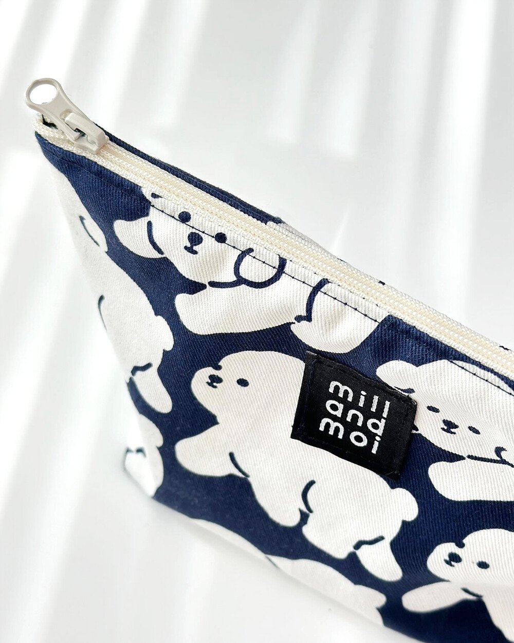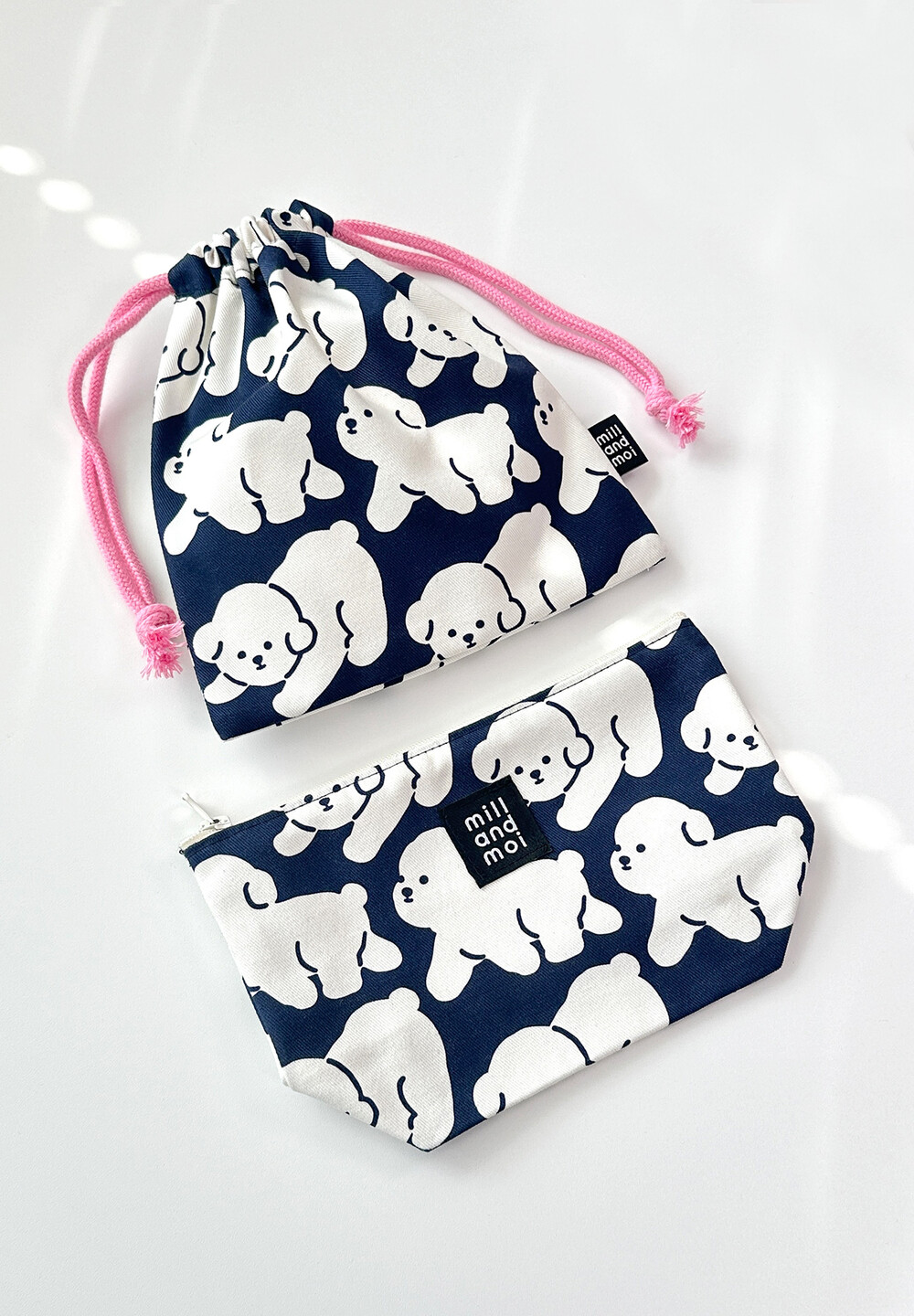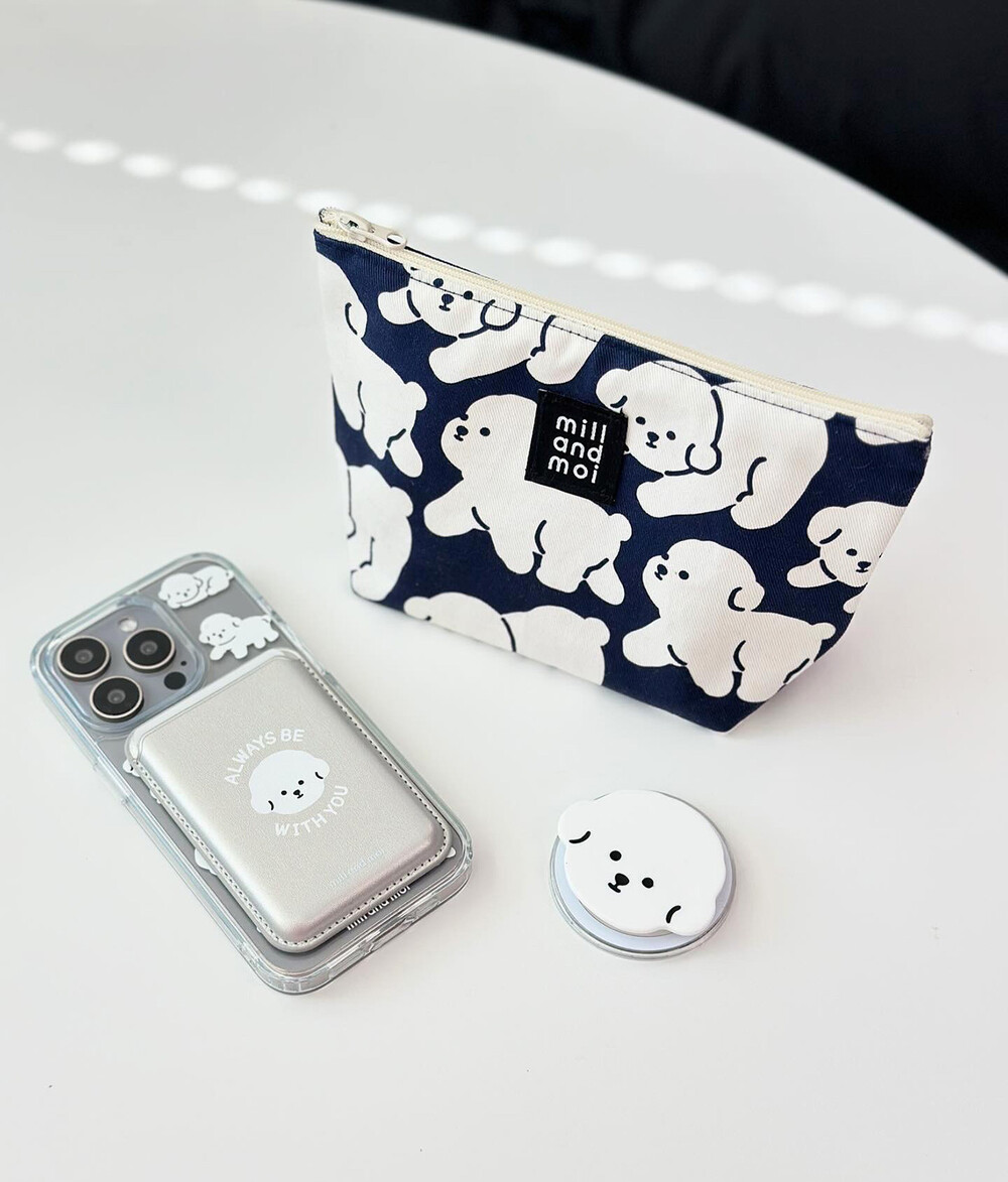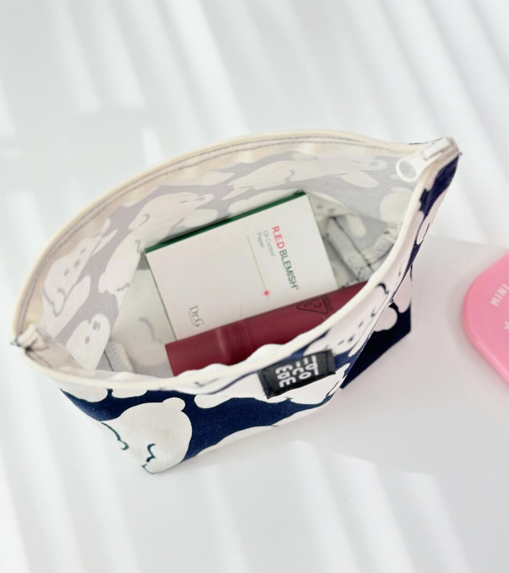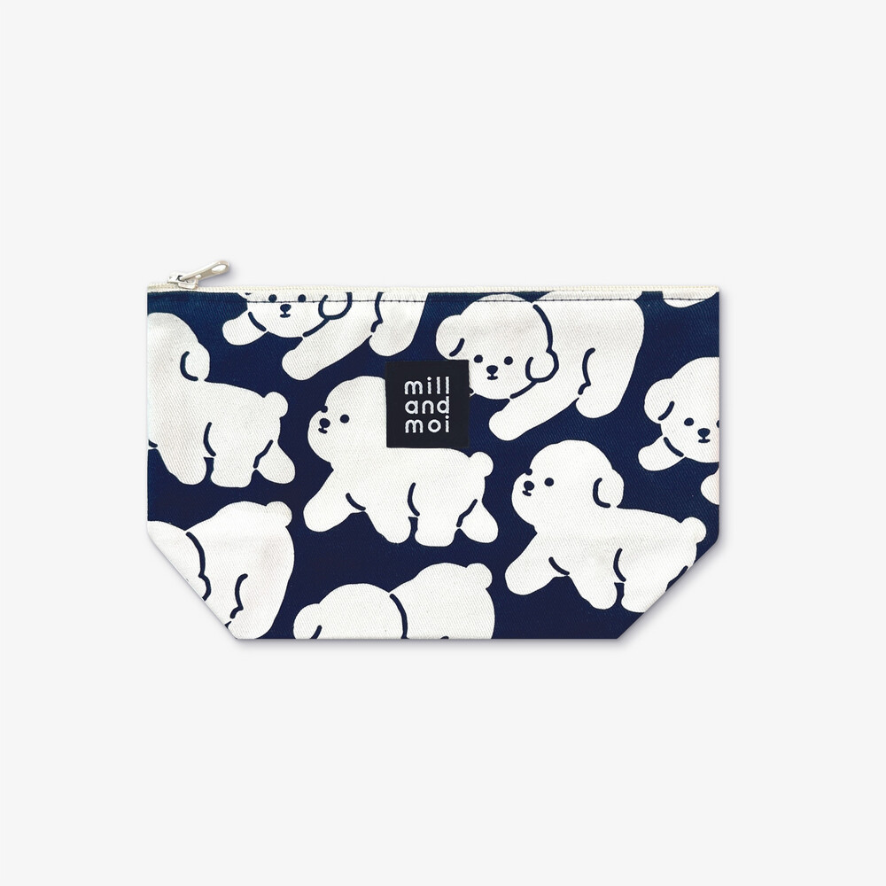 동글 동글한 하얀 보숑이들이 걷고 있는 귀여운 패턴의 파우치! 쨍한 네이비 색상과의 조합이 너무 예뻐요.