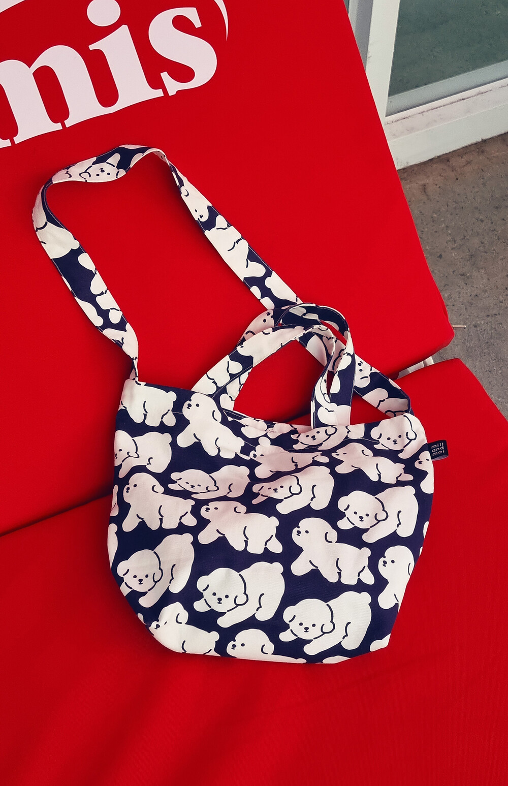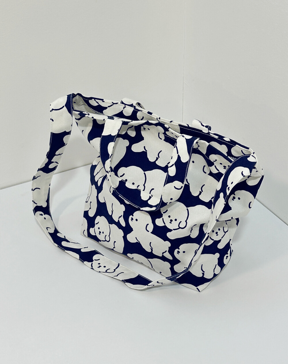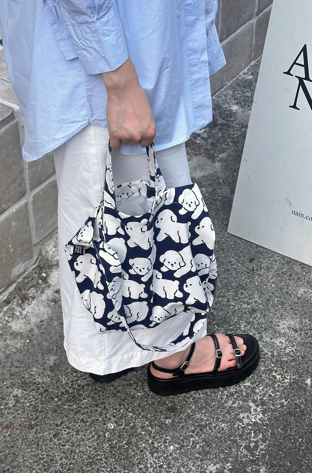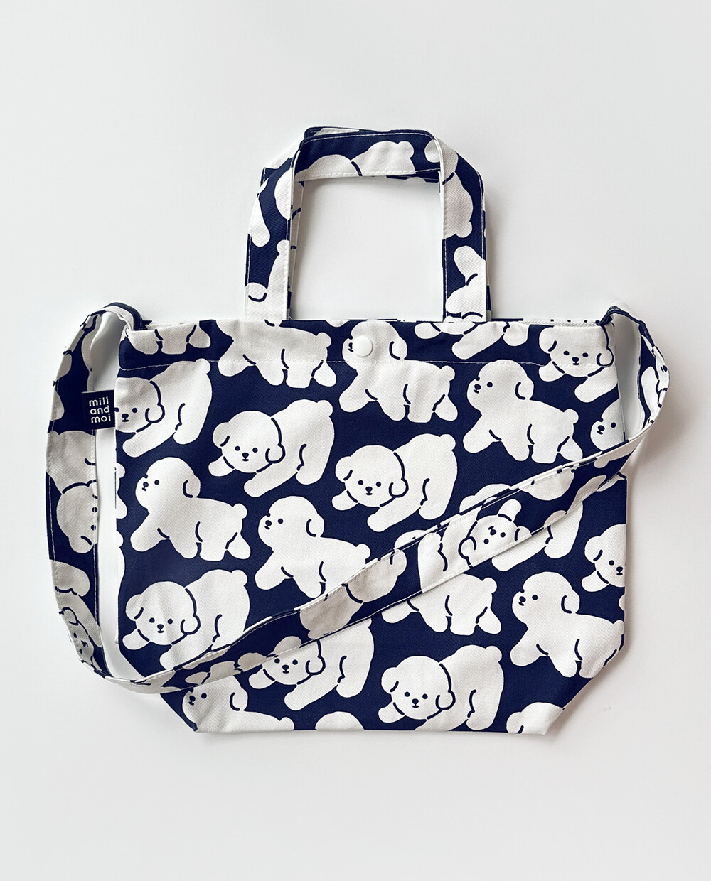 네이비색에 하얀 비숑 캐릭터 패턴으로 심플해서 어디든 잘 어울립니다.