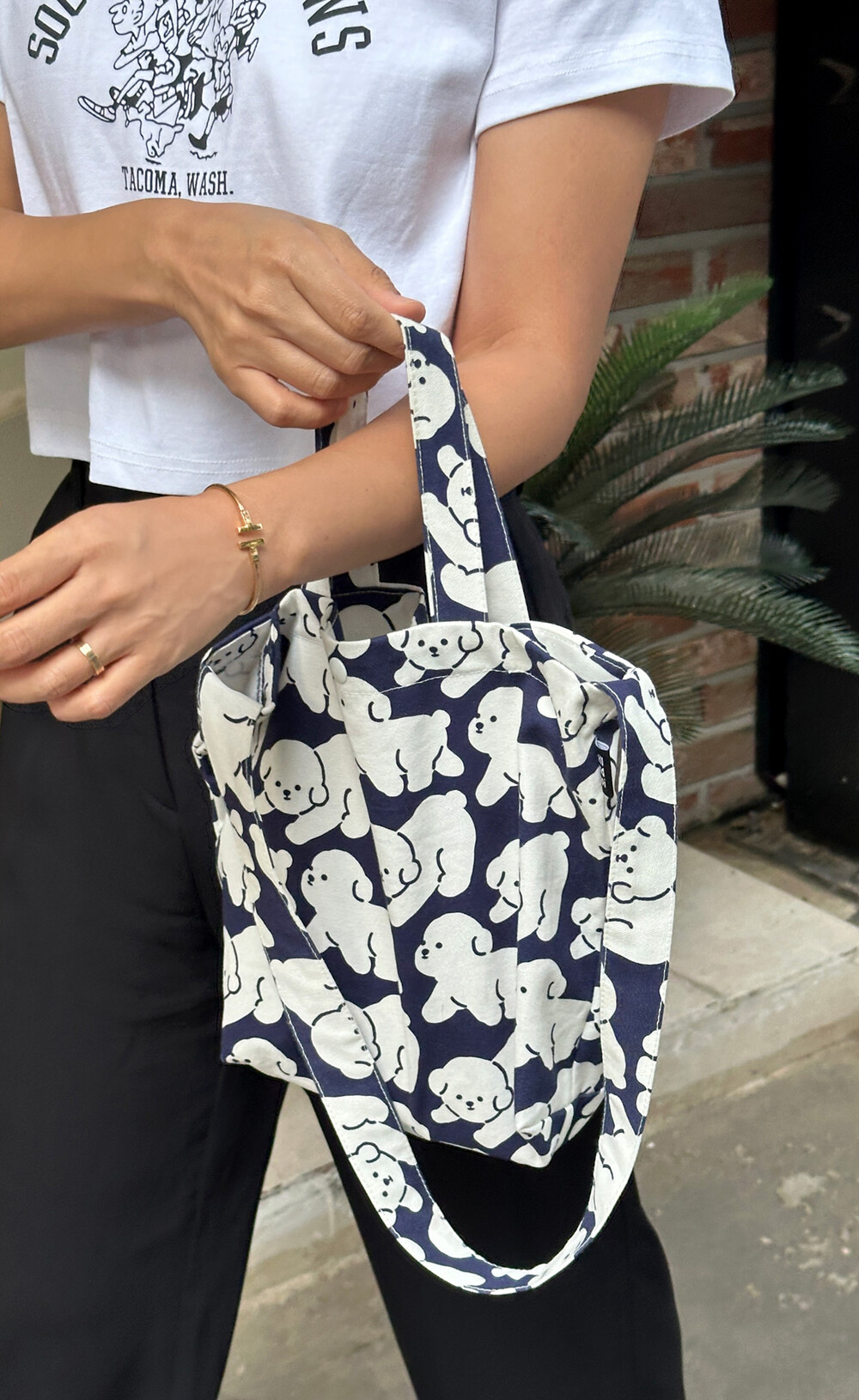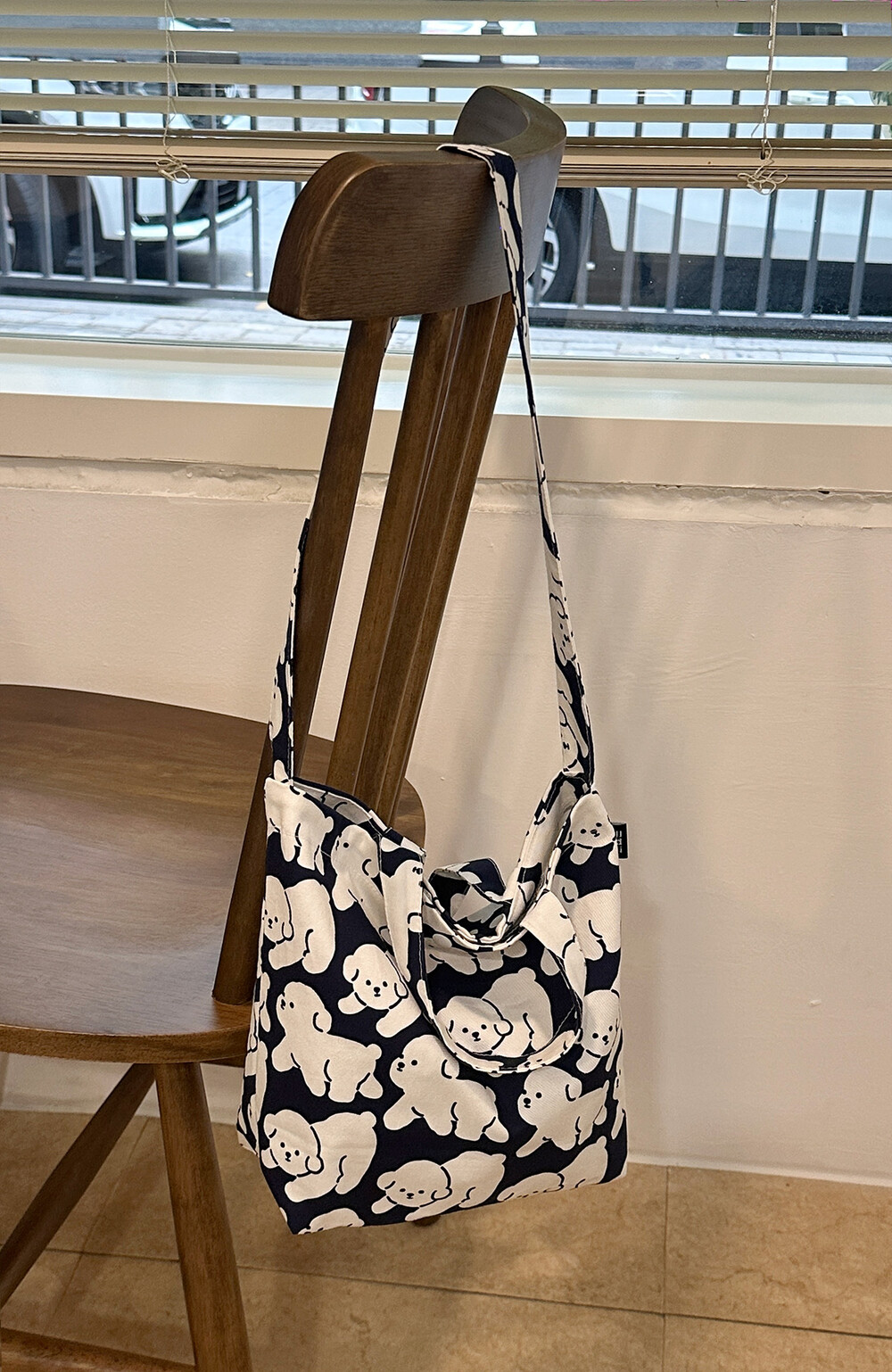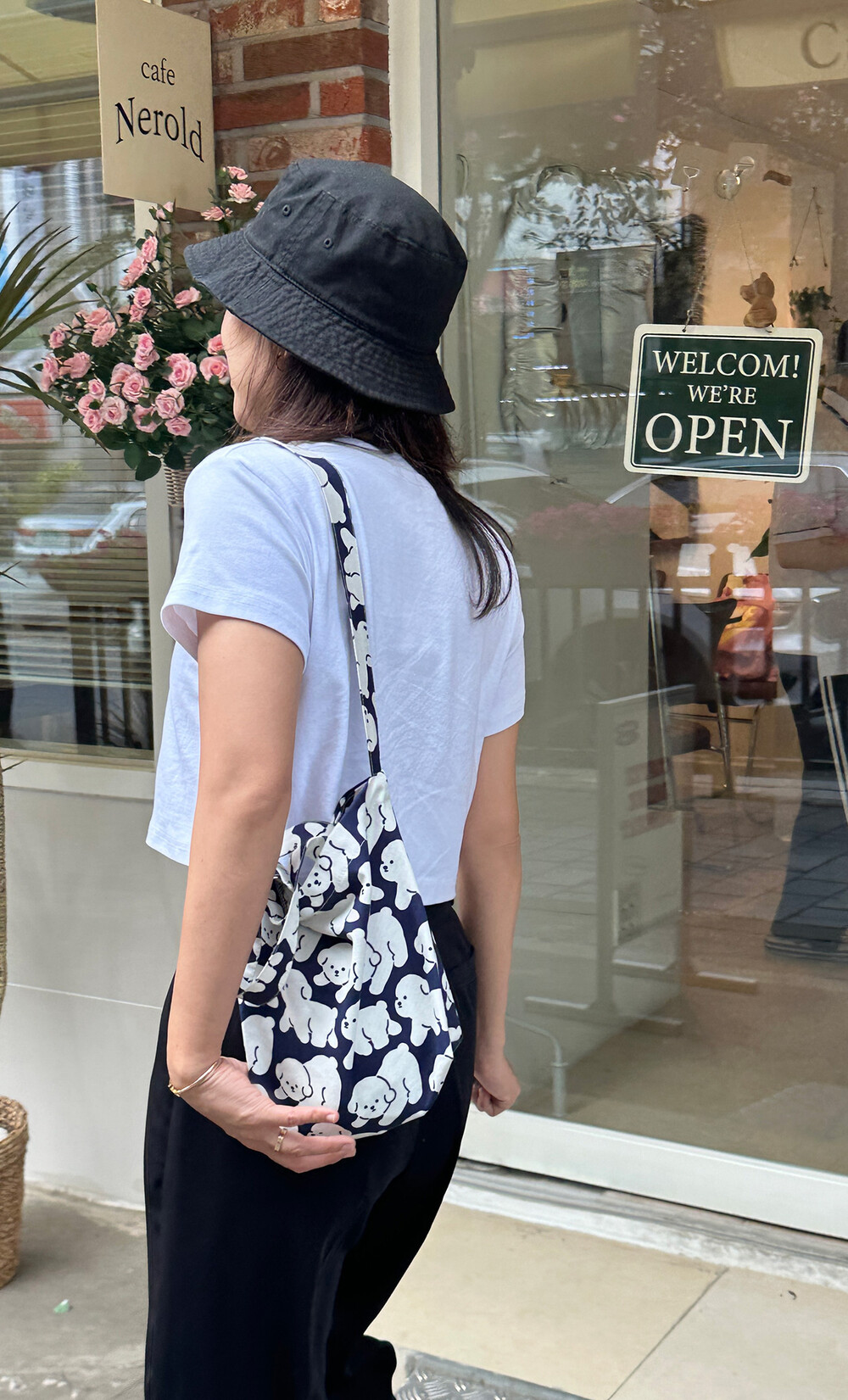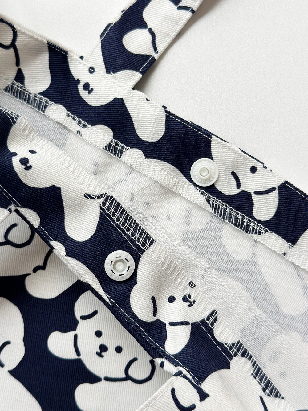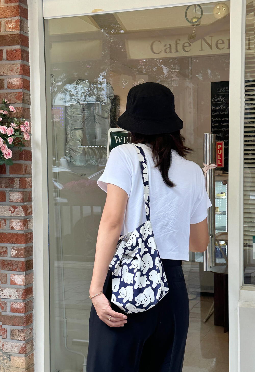네이비색에 하얀 비숑 캐릭터 패턴으로 심플해서 어디든 잘 어울립니다.