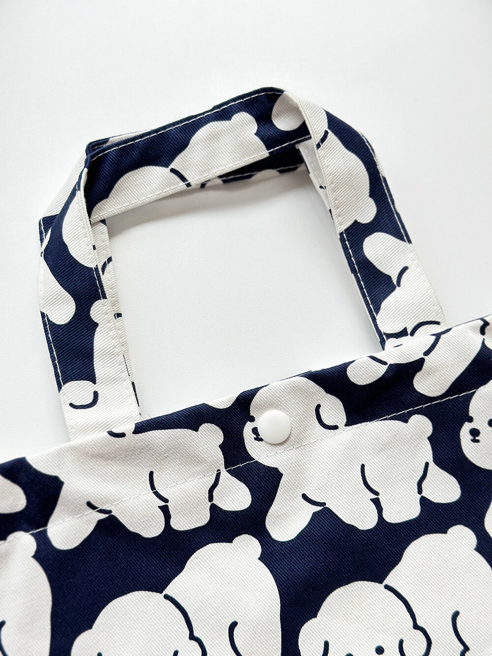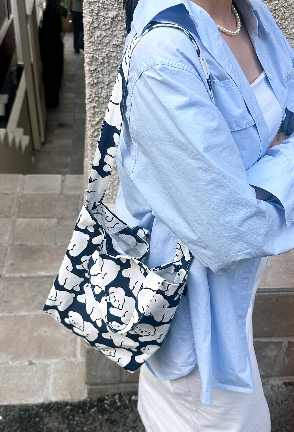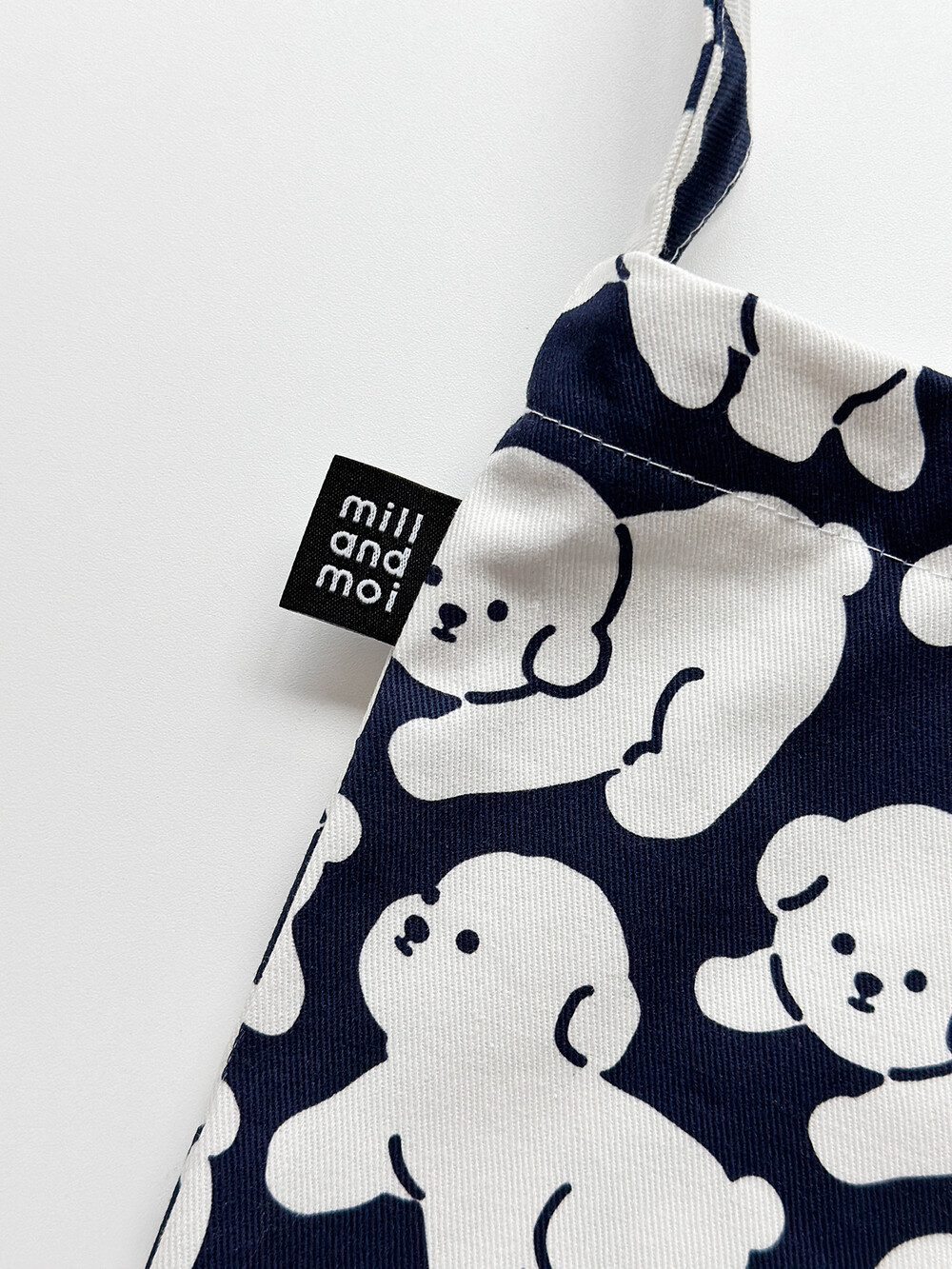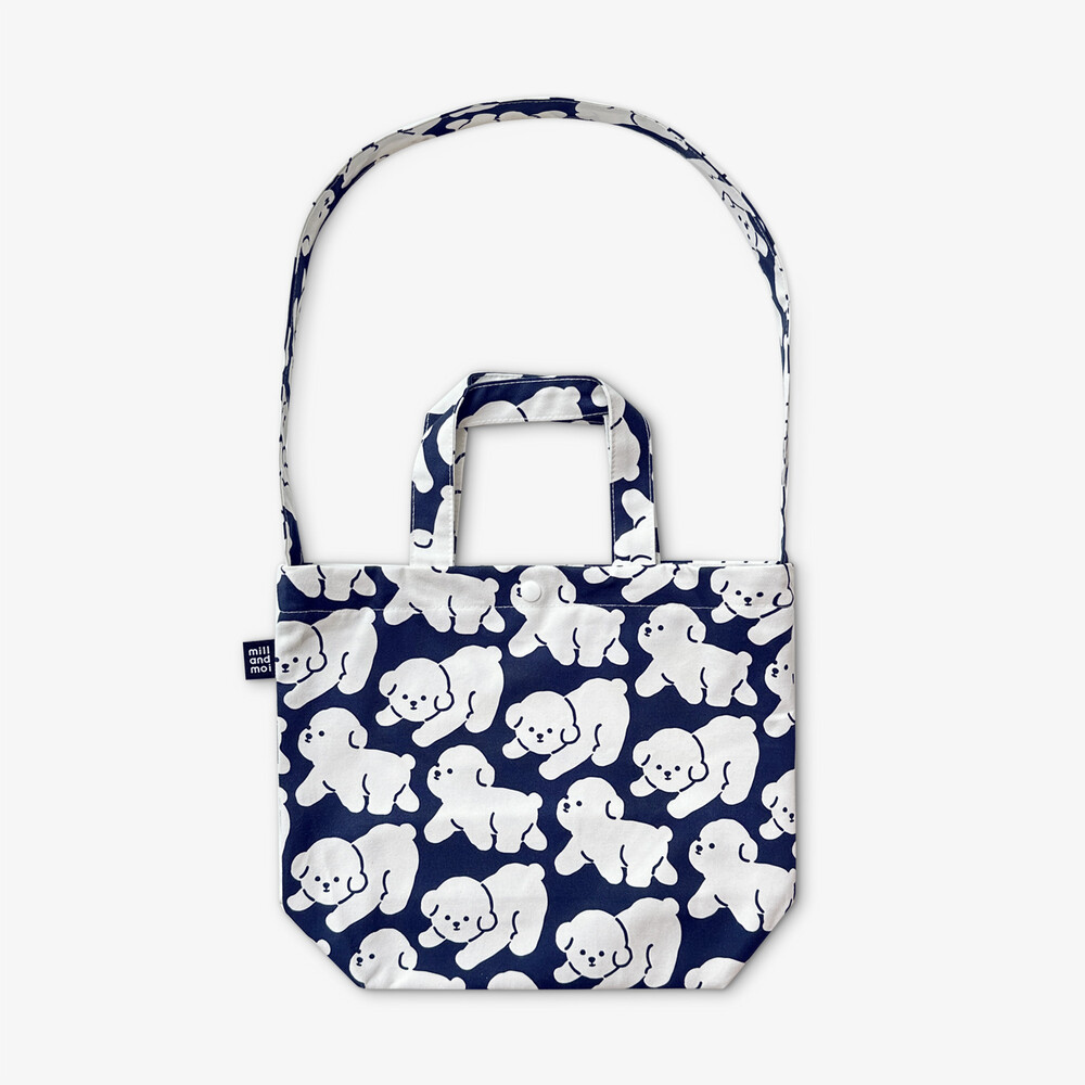 네이비색에 하얀 비숑 캐릭터 패턴으로 심플해서 어디든 잘 어울립니다.