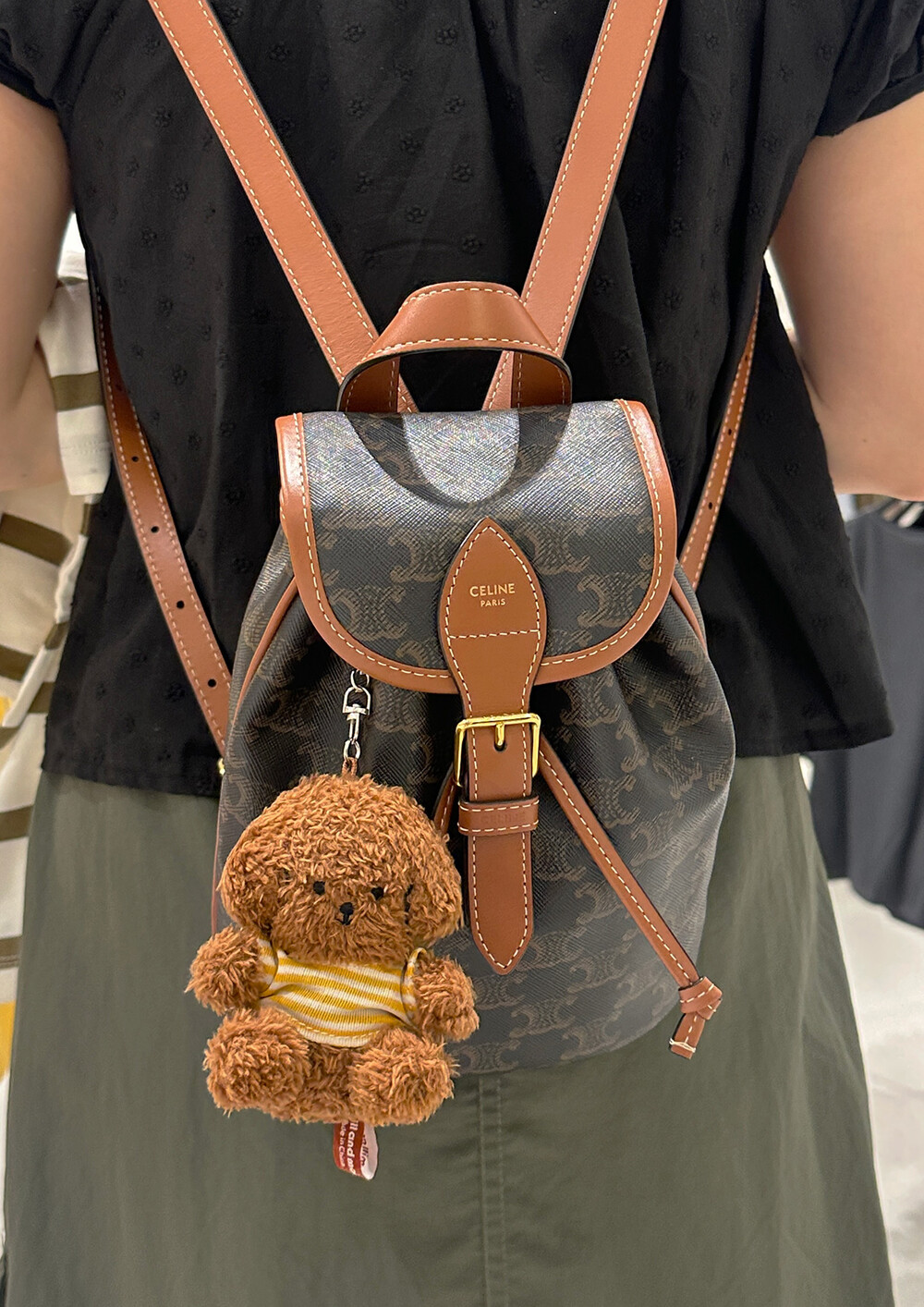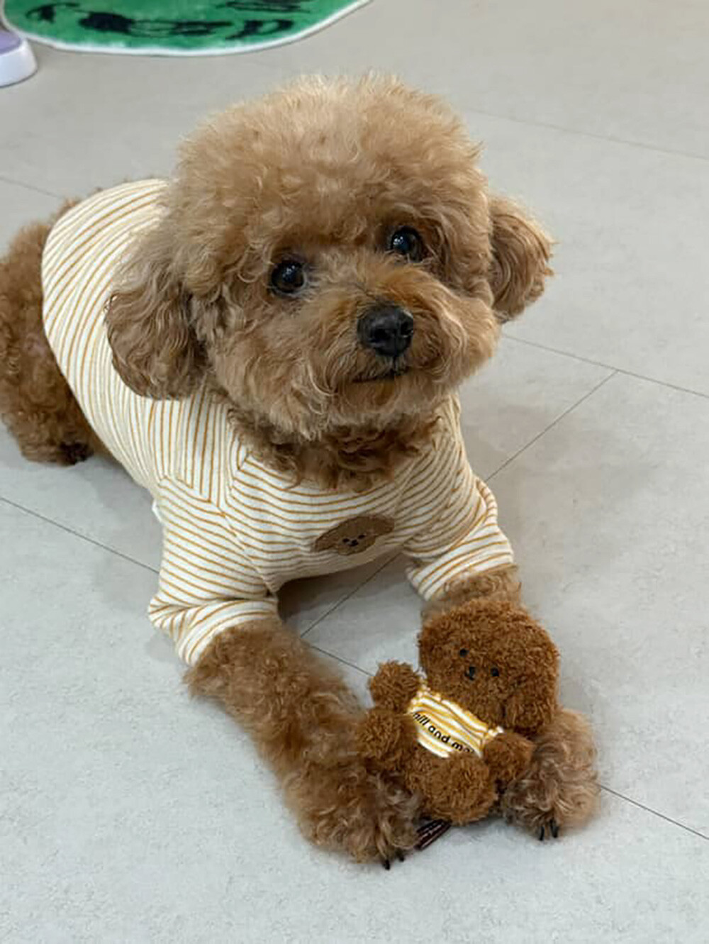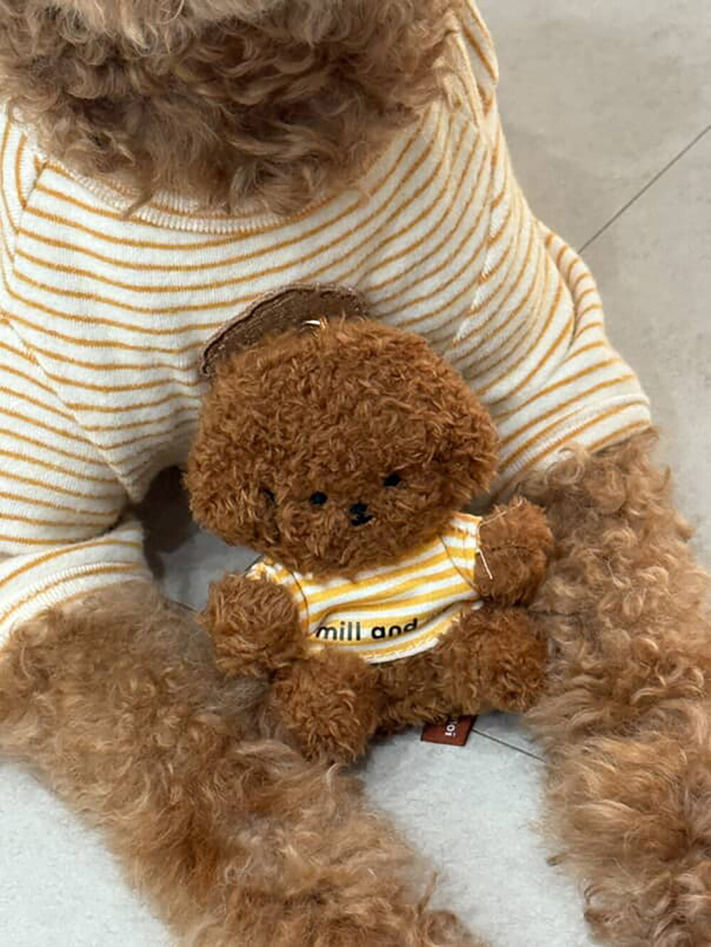 노란 줄무늬 티셔츠는 로고가 뒤로 위치하게 입히면 더 귀엽습니다. :)