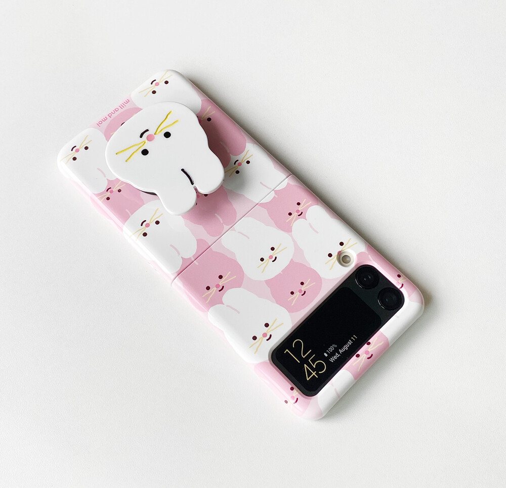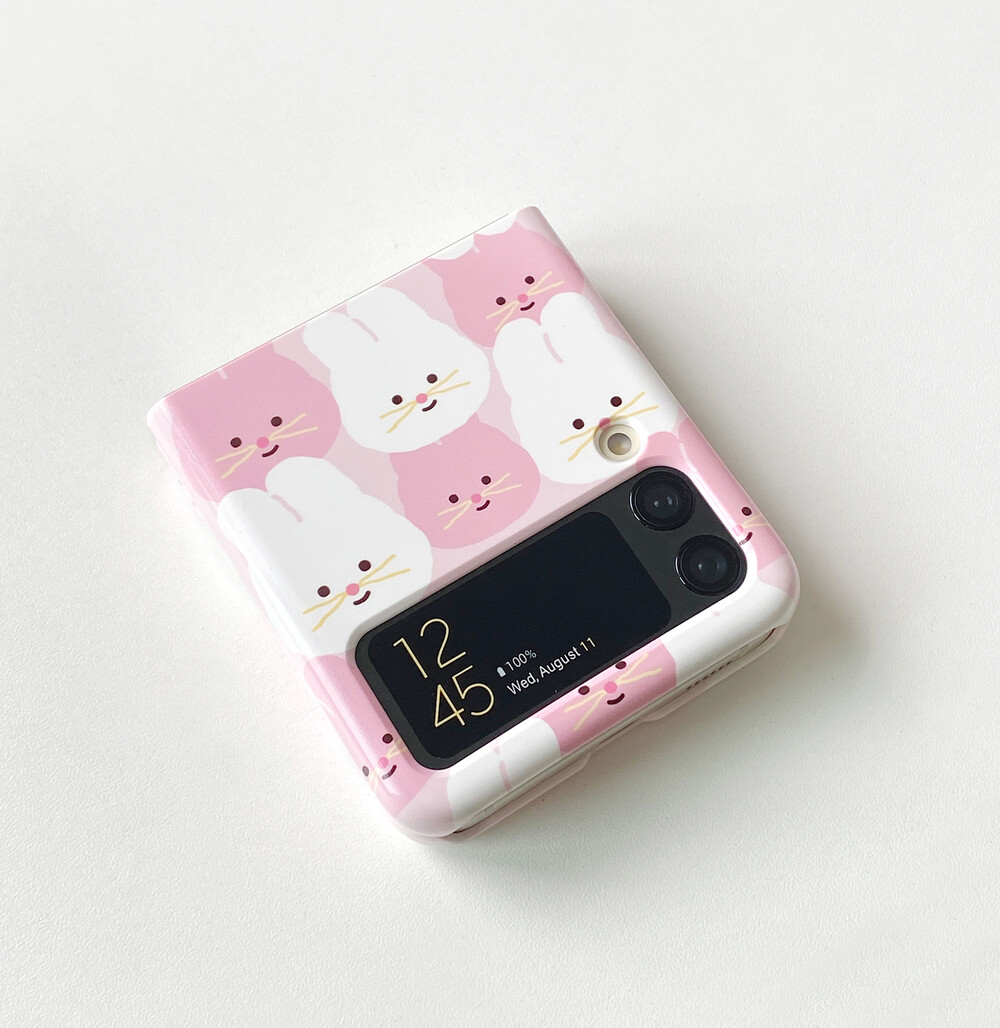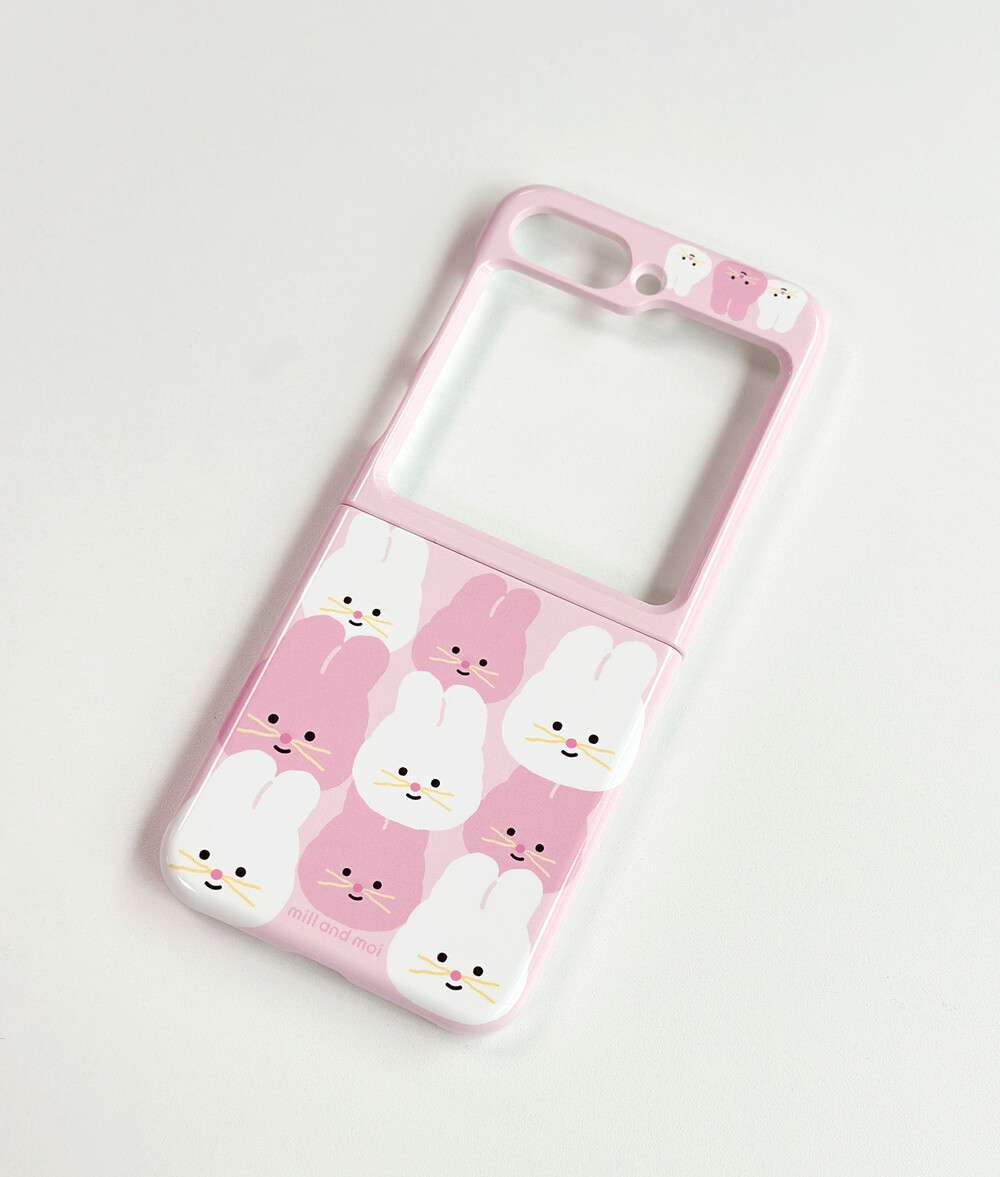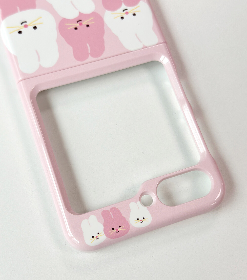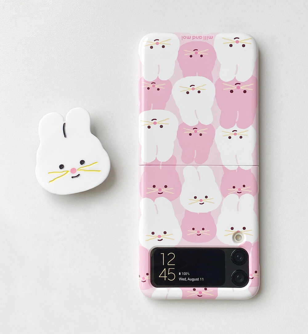 화이트, 핑크색의 사랑스러운 토끼 캐릭터, 바니핑의 귀여운 얼굴이 와글와글 꾸러미로 가득한 지플립 케이스입니다.